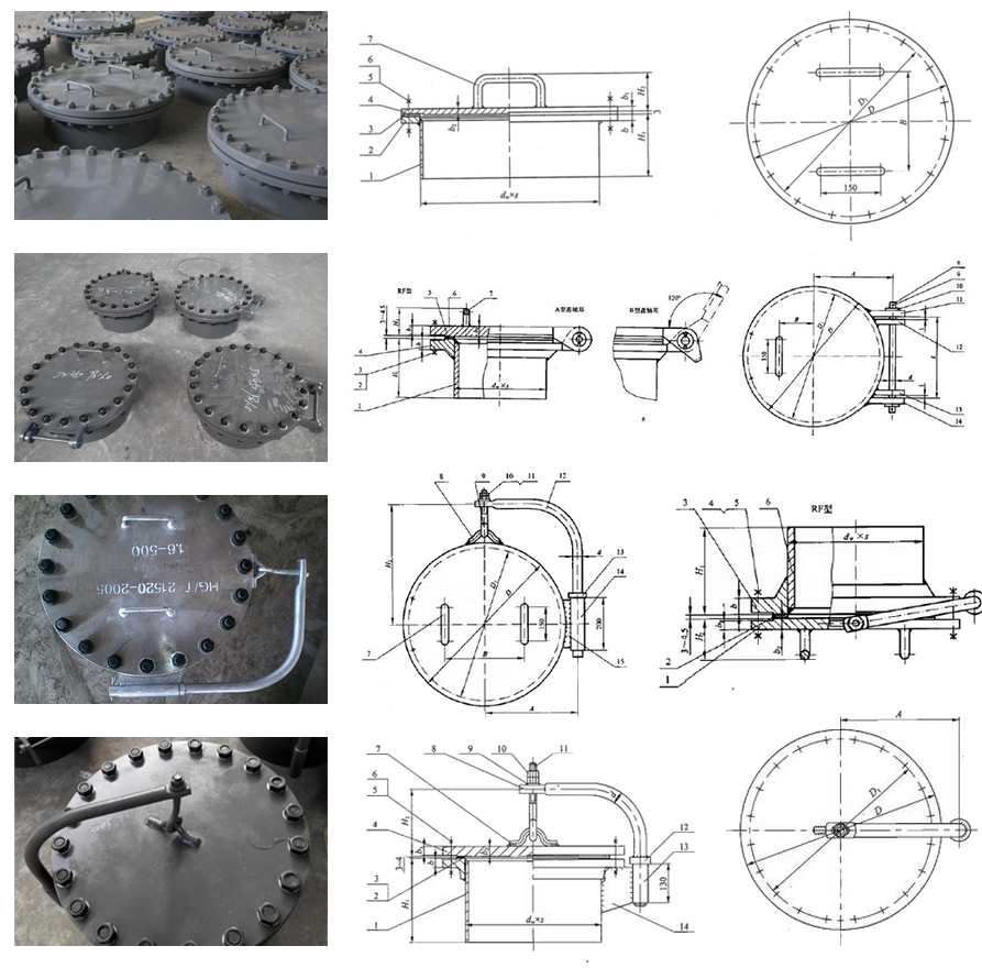 鋼制人孔安裝在儲罐頂部或儲罐側(cè)壁的補強(qiáng)圈上,在進(jìn)行建罐、清罐、倒罐和維修時,工作人員可經(jīng)人孔進(jìn)出油罐,也可以利用人孔進(jìn)行通風(fēng)。人孔可分為:常壓人孔、罐頂人孔、罐壁人孔、帶心人孔等。