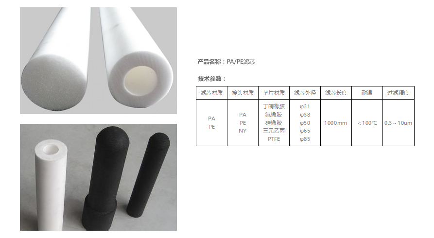 PA/PE燒結(jié)濾芯采用超高分子量為300萬以上的顆粒燒結(jié),經(jīng)篩分后裝入內(nèi)外鏡面的模具中加壓帶壓力放在燒結(jié)爐中,在一定的溫度下,一定的燒結(jié)保溫時間,出爐、泠卻、出膜制造而成。濾芯具有結(jié)構(gòu)緊湊、結(jié)實、質(zhì)輕、耐壓、無毒無味、孔徑分布均勻、對酸堿溶劑具有良好的抗腐蝕性能等特點。用于大型水處理設(shè)備,可采用自動或手動反沖脫渣法,固體微?;厥湛刹捎酶沙鲈?,不需經(jīng)常更換濾芯,可自動化操作。