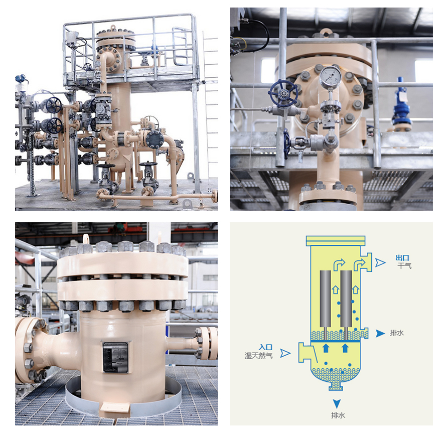 氣體從容器下部空間進(jìn)入容器,較大的液滴由于重力作用,在進(jìn)入濾芯前先從天然氣中分離出來(lái)。較小的液滴隨天然氣向上進(jìn)入聚結(jié)濾芯內(nèi),由內(nèi)向外經(jīng)過(guò)濾芯聚結(jié)分離出來(lái)。凈化后的氣體經(jīng)過(guò)濾芯后從設(shè)備上部的出口流出。