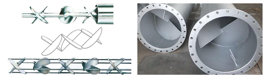 SD型靜態(tài)混合器的混合過程是靠固定在管內(nèi)的混合元件進行的,由于混合元件的作用,使流體時而左旋時而右旋,不斷改變流動方向,不僅將中心液流推向周邊,而且將周邊流體推向中心,從而造成良好的徑向混合效果。